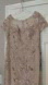 The dress is stunning in person! Champagne dress with cap sleeves, floor length gown with mesh overlay. The mesh overlay has embroidery, sequins, and beaded detail.