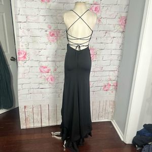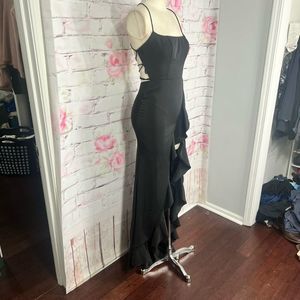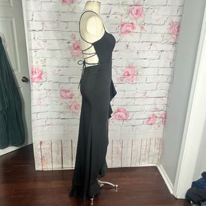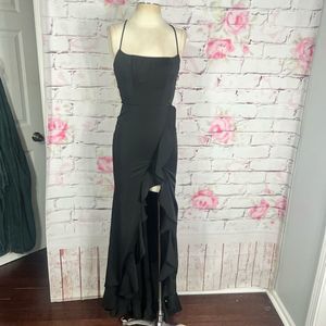 Elegant black maxi dress. Features a ruffled slit and strappy back. Perfect for evening wear.