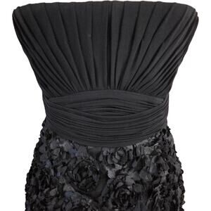 Beautiful La Femme little black dress! Sophisticated rosettes with pleated bodice. Side Zip. Not much stretch at bottom hem