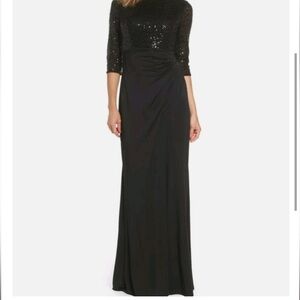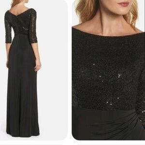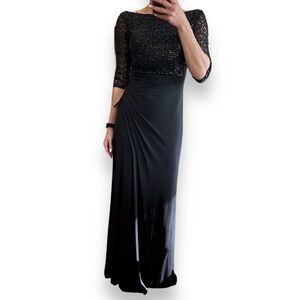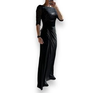 La Femme Black Sequin Jersey Column Gown 4 NWT new 3/4 long sleeve ruched 24858