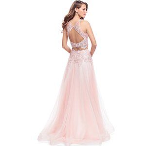 Lovely two piece gown with a lace beaded top and high illusion neckline. Featuring a tulle skirt with a lace detail on the belt and an open back. Back zipper closure.