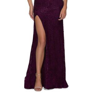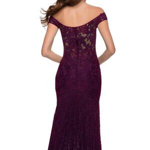 La Femme Dark Berry Off the Shoulder Stretch Sparkle Lace Mermaid Gown