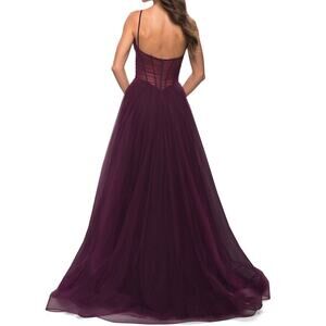Make a breathtaking entrance in this La Femme Corset Maxi Gown, designed with a sheer structured bodice and flowing tulle skirt. Featuring a high side slit, subtle pockets, and an airy A-line silhouette, this gown blends sophistication and allure — perfect for formal events, galas, or evening occasions.