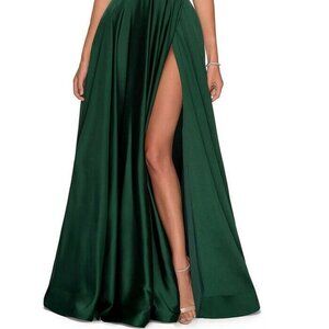 La Femme Emerald Green Sleeveless V-Neck High Leg Slit A-Line Gown