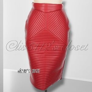 Turn heads with this battle-ready bustier top and pencil skirt SET. These pieces have been custom designed in soft quilted vegan leather and are inspired by the intricate musculature construction of Vlad Dracula’s Order of the Dracul battle armor from the movie. The blood red color of the set is symbolic of the blood that he spills and craves. Bustier top sits at the waist, with allover boning to keep the structure. The quilted shoulder straps with cap sleeves are removable if you'd like to show a little more shoulder. The matching pencil skirt has a slit in the back Gunmetal zippers in back for both. Designed by Lynh Haaga and Micheline Pitt of Vixen.