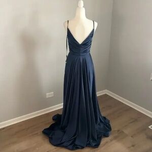 This beautiful long satin dress features a sleeveless, deep V-neckline with ruched bodice supported with a strappy back. The A-line skirt is tailored with a high leg slit and brings drama with a sweep train finish. This La Femme dress is your excellent pick when you dare to look stylishly spectacular!