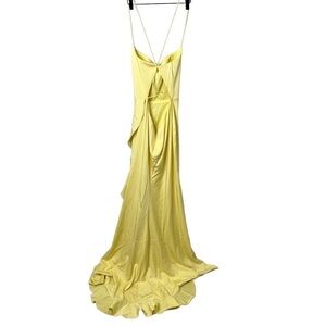 La Femme Yellow Gown Dress Flutter Slit Tie Back Size 12 Approximate Flat Lay Measurements: pit to pit: 15” length: 64” waist area: 16” Excellent Used Condition, no flaws, no tears, no stains Features: lined, hidden back zip closure, ties in back, scoop neck, sleeveless, full length trumpet skirt, thigh high flutter leg slit, chic, special occasion, gala, pageant, formal, homecoming, prom, wedding R34