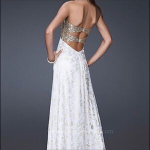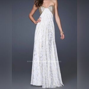 Stunning La Femme formal gown featuring a gold sequin sweetheart bodice and flowing white/gold lace overlay skirt. Strapless A-line silhouette with flattering empire waist and floor-length design. Perfect for prom, pageant, wedding guest, black tie events, gala, evening parties, or formal photoshoots. Elegant, glamorous, and timeless.