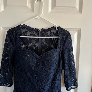 Petal-like scallops and illusion lace create a lovely Queen Anne neckline on this sheath dress that twinkles softly with a scattering of rhinestones.