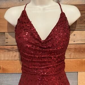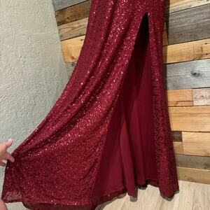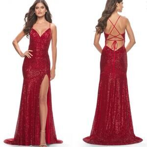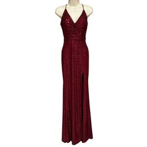 La Femme Lace-Up Open Back Ruched Sequin Floor Length Gown In Red Maroon Size 0