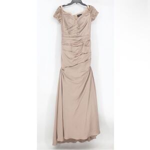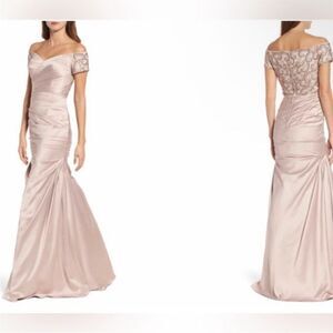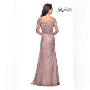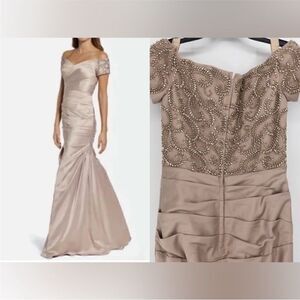 La Femme NWT Beaded Back Off the Shoulder Ruched Crepe Satin Gown Champa…