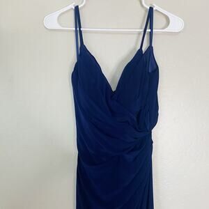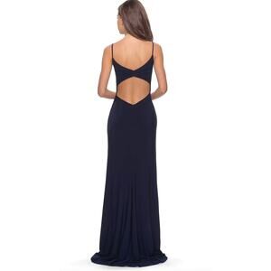 La Femme Navy Blue 28079 Surplice High Slit Jersey Formal Gown Bridesmaid Dress