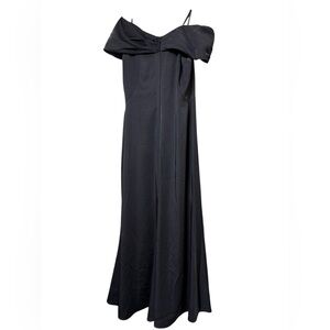An elegant off-the-shoulder neckline frames a floor-length gown that skims your figure and flares out gently into a trumpet skirt.