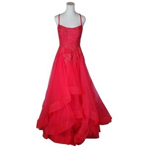 Make an unforgettable entrance in this stunning La Femme Embellished Tulle Ball Gown. This vibrant hot pink gown features a flattering fitted bodice adorned with intricate floral lace embroidery and tiny shimmering rhinestones for a touch of sparkle. The delicate spaghetti straps cross in the back for added elegance, while the voluminous layered tulle skirt creates a dreamy, princess-worthy silhouette. Crafted from 100% polyester with a full lining, this gown is perfect for prom, formal events, pageants, quinceanera, or any special occasion where you want to feel truly glamorous.