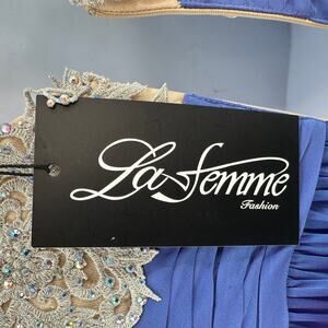 La Femme Prom Dress Women's Size 6 – Blue-Violet Formal Gown, Sleeveless Design with Embellished Lace Bodice, Fitted Top with Sheer Illusion Detailing, Flowing Full-Length Skirt, Hidden Back Zipper Closure, Elegant and Sophisticated Silhouette Perfect for Prom, Formal Dances, Galas, or Special Evening Events.