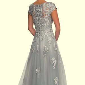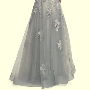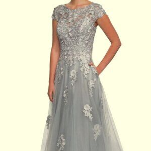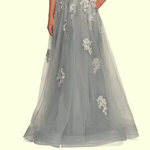 La Femme Silver Embroidered Embellished Mesh A-Line Gown