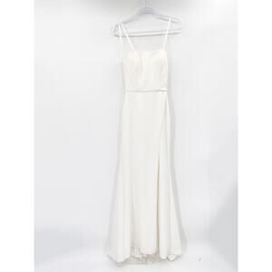 Form fitting strapless dress with cross over skirt. A front slit completes the look. Back zipper closure.
