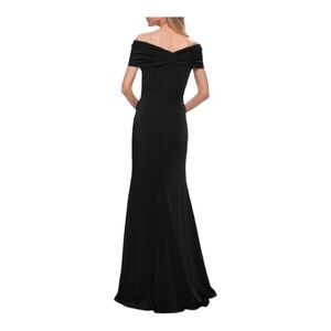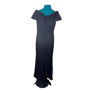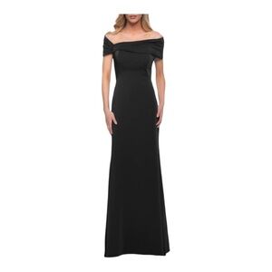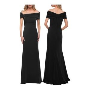 An elegant off-the-shoulder neckline frames a floor-length gown that skims your figure and flares out gently into a trumpet skirt.