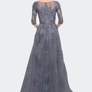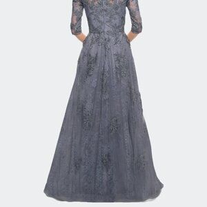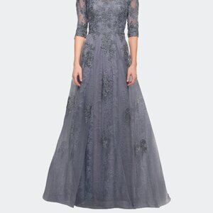 La Femme Slate Blue Shimmer Floral Lace & Tulle Gown