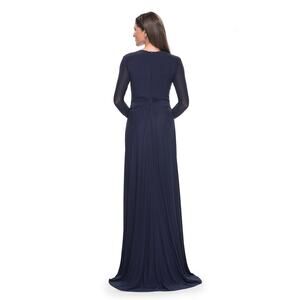 Exude timeless elegance in this 30048 La Femme long dress. The fitted bodice has a V-neckline, long sleeves, and a closed back. Its waistline has a ruched effect for a flattering fit and the skirt has an A-line silhouette for effortlessness. The dress gracefully ends with a sweep train and pairs well with high heels.