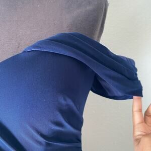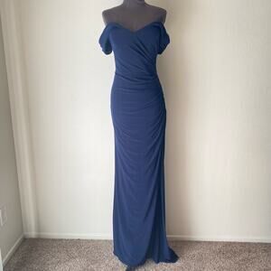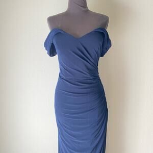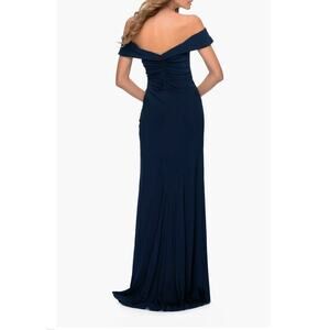 An elegant shrugged-off neckline shrouds the shoulders in the smooth jersey fabric that gives this gown its slinky drape.