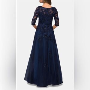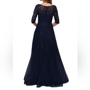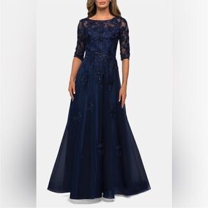La Femme Floral Lace and Tulle Navy Gown | Size 6