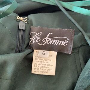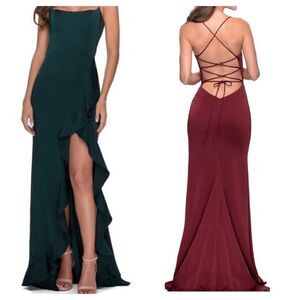 La Femme Lace-Up Open Back Ruffle Prom Dress