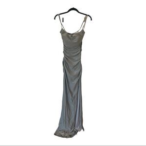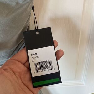 La Femme Silver Tie Back Sleeveless Slit Satin Formal Gown Size 6 NWT