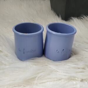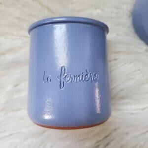La Fermiere French glazed terracotta yogurt pots with La Fermiere written on the front. This adorable set of 2 pots are in excellent condition (no stains, no rips, or damage and come from a smoke and pet-free environment).