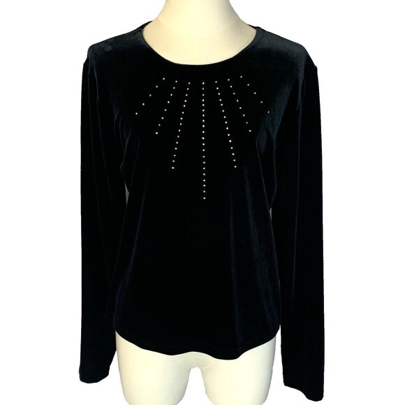 La Fete USA Black Velvet Long Sleeve Pullover Top Rhinestone Front Size S/M