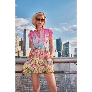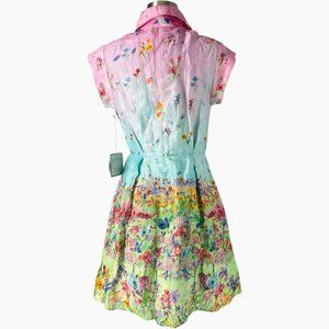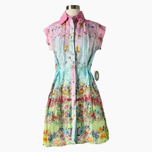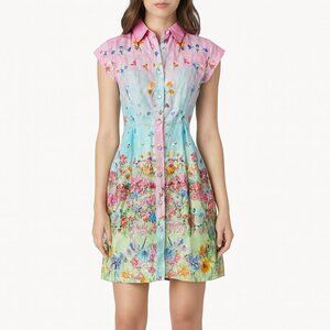 A vibrant and artistic statement piece, this La Fuori silk dress features a painterly floral print across a gradient of pink, aqua, and green. Designed with a collared neckline, button-front closure, cap sleeves, and a flattering fit-and-flare silhouette, it’s the perfect warm-weather dress for resort days, garden parties, or elevated everyday wear. Crafted from 100% vegetarian silk, it’s lightweight and breathable with a luxe drape.
