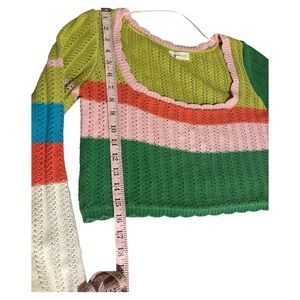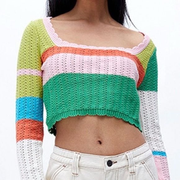 Bright crop top with bold stripes. Features long sleeves and a square neckline. Ideal for a trendy look.
