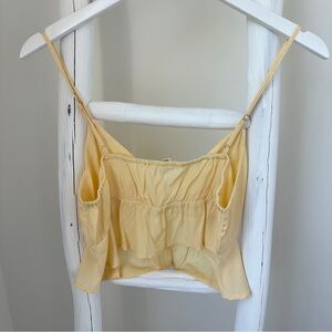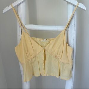 •This stylish camisole from La Hearts features a soft yellow hue and a cropped design. The lightweight fabric and delicate spaghetti straps add a touch of elegance to any outfit.