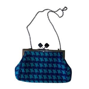 La Je Houndstooth Print Satchel Clutch Kisslock Shoulder Purse Vintage Blue and green. Snap closure, Inside zippered compartments, little to no signs of wear. Bag 12” width, 8” length. Strap length 20.5” length.