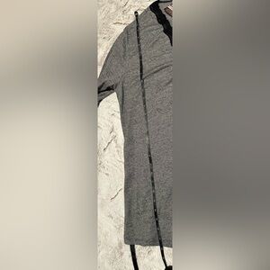Comfortable gray wrap top. Features black lace trim. Long sleeves. Ideal for lounging. Pattern similar to leaves