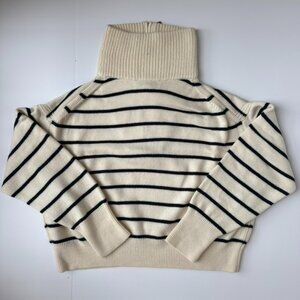 La Ligne Bastien striped merino wool quarter-zip sweater in cream and navy, size Small. Features braided accents, ribbed trim, a collared neckline, and mid-weight stretch knit for timeless preppy style. Soft, warm, and perfect for layering with denim, trousers, or winter outerwear. Great condition from a smoke-free home. Ships same or next day.