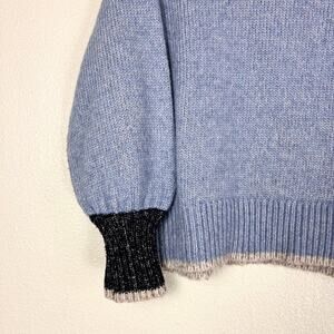 La Ligne Big Blue Oversized Turtleneck Sweater in women’s size Small. Luxuriously soft and cozy alpaca-blend knit in a heathered periwinkle blue with contrasting black and beige ribbed trim. Features an exaggerated foldover turtleneck, voluminous balloon sleeves, and a relaxed, oversized silhouette — effortlessly chic for cool-weather layering.