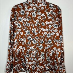 This stunning blouse by La Ligne showcases a warm brown base beautifully contrasted by delicate white floral patterns, exuding a vintage charm. The elegant design features a sophisticated collar and a smooth fabric finish, making it ideal for both casual outings and more formal events.