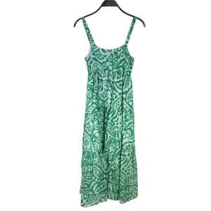 Pale blue and Kelly Green Batik-inspired print Straight neck, Empire waist, Shirred tiers, Loose, off the body fit, Side seam zipper, Midi length, Side seam pockets.