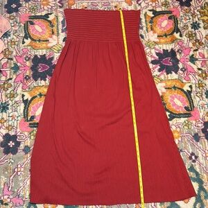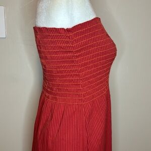 La Ligne Meredith Smocked Bodice Strapless Midi Dress is perfect for the upcoming season. This strapless dress has a stretchy smocked bust and an a-line midi length skirt. This red dress has orange stitching. Pockets at hips. Self is 76% cotton, 21% polyamide, 3% Elastane. Dress is clipped to fit mannequin Made in the USA! Size Large. EUC.
