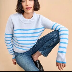 Get on board with our signature crew neck, pale and tonal blue striped sweater. The 7-ply wool and cashmere sweater, is shrunken and slightly cropped, but as always, comfort and style not mutually exclusive.