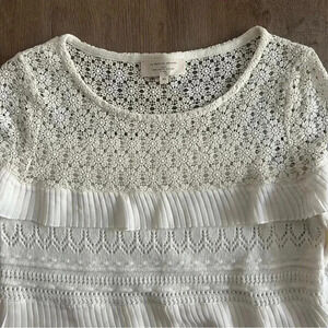 Long sleeve knit pullover sweater from Sezáne, with lace and pleated inserts. Very romantic and feminine.