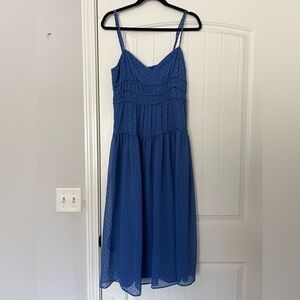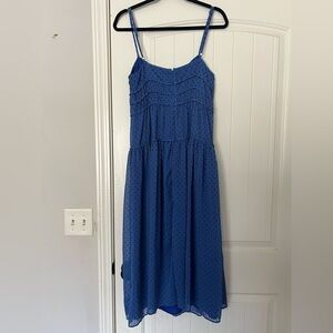 Blue printed crepe (100% Polyester). Hourglass. Sleeveless. Sweetheart neckline. Hidden back zipper closure. Fully lined. 47" from shoulder to hemline.