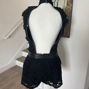 Elegant and Stylish Designer Crochet Romper by La Marque. Beautifully detailed black crochet short romper with open back, high neckline and leather accents on waist and side pockets. Back zipper closure. Gently worn.