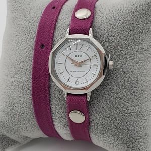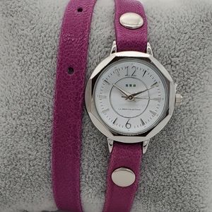 Italian leather strap, stainless steel case back, Japanese movement, splash resistant are attributes of this gorgeous Del-Mar raspberry wrap watch. Face of watch has an octagonal shape and is silver, strap is adorned with silver studs. Watch is right for a petite wrist, but recommend up to 7 1/2" wrist.