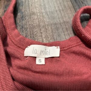 The La Miel Ribbed Tank Top Lot of 2 in Size Small features two stylish tank tops in red and brown colors. With a round neckline and a basic style, these tops are versatile and can be easily paired with different bottoms for a trendy look.
