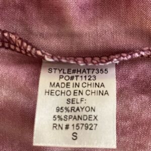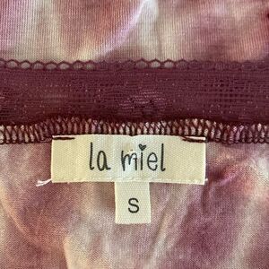 La Miel short sleeve v-neck relaxed fit blousy t-shirt with lace sleeves, lace detail around neckline, and boho tie-dye pattern in mauve and white. In good condition!