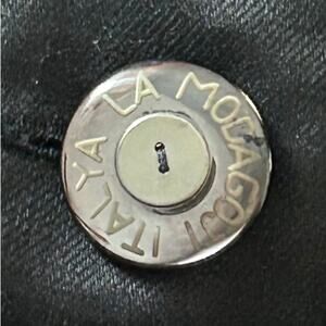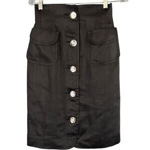 La Moda Goji Italya Vintage Pencil Mini Skirt Women's 7A2/ Size U S2 Black Hemp Linen. Authentic & in excellent condition. Classic button front pencil skirt with crystal clear logo engraved statement buttons. Faux flap pockets. Waist 26", Hip 37", Length 24.5". Material: 100% Hemp Linen shell. 100% Polyester lining. Made in Japan: Jay Tooley House. Fast shipping.