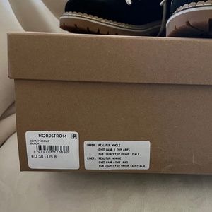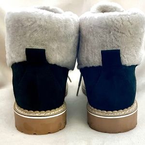 Made in Italy and almost new! La Montelliana makes gorgeous boots that combine European fashion and function. Features black suede leather, genuine shearling trim, and a sturdy synthetic lug sole. In almost new condition - worn just once for an indoor event. Includes detached tags, original packing material and box. The outside left boot that has, what appears to be, a very tiny spot of glue (likely from the manufacturing process). It is barely noticeable but pointing it out to be transparent.