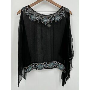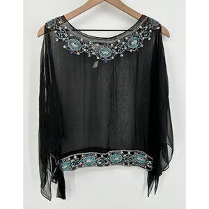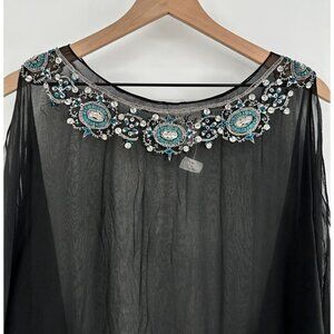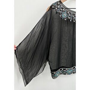 La Nuit 100% Silk Top Women Med Black Sheer Beaded Sequin Open Shoulder Side Tie
